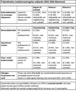 Door de verschillen in prijs per soort isolatie kan iedere geïnteresseerde bewoner zelf beslissen, wat binnen het beschikbare budget past. We kunnen bij voldoende belangstelling korting bedingen. Dat zal vooral extra schelen bij dakisolatie van buiten en maatregelen ter behandeling van wateroverlast in de kruipruimte. Bij deze isolatiemaatregelen komt u vaak ook in aanmerking voor ISDE subsidie.